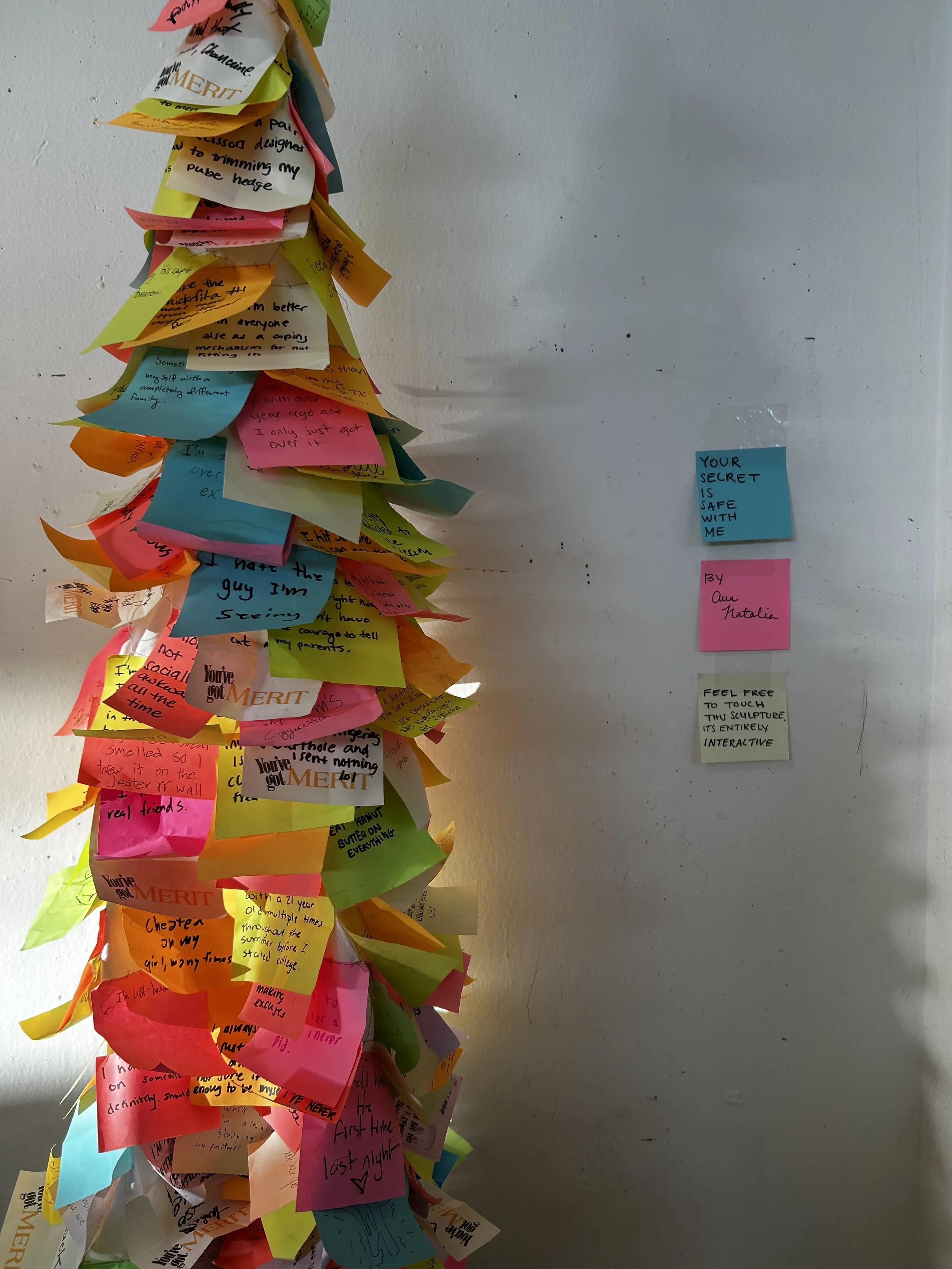 I love the feminist craft movement of the 70s, notably Judy Chicago’s “Dinner Party.” I also LOVE the Fluxus movement, specifically their values of community engagement, play, and fluidity. I recently read Jorge Sanjinés’ manifesto where he explains the importance of involving your community within art-making, which directly inspired my post-it note project.