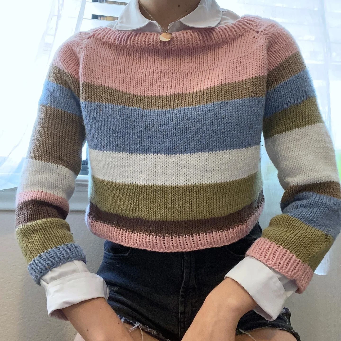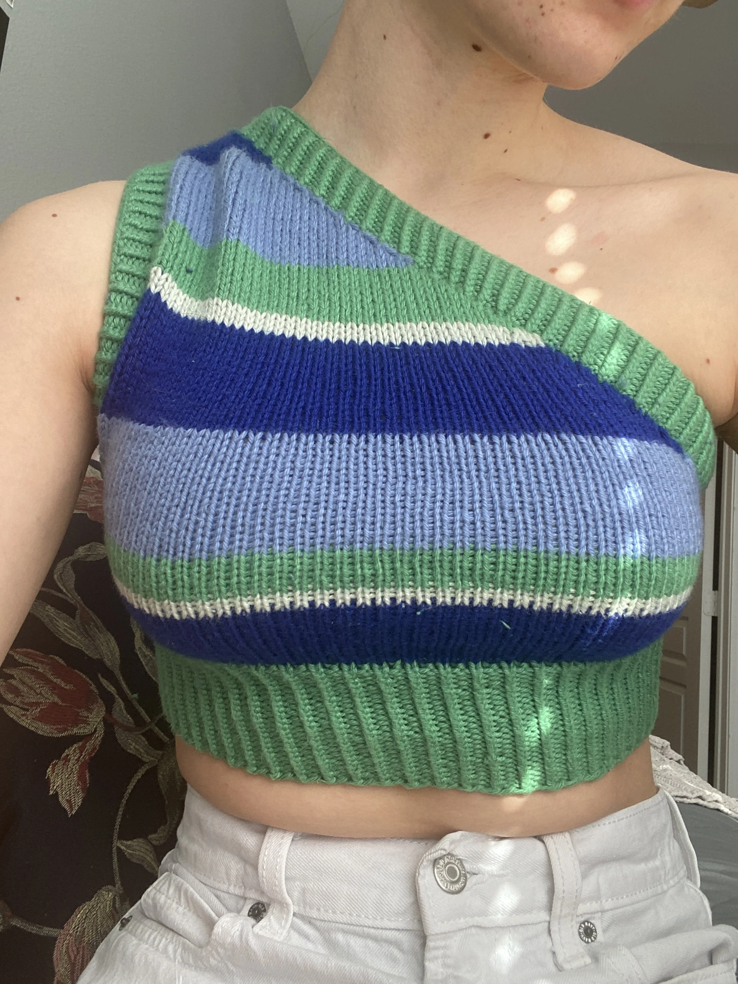 I began knitting during COVID-19, as I am sure many people did. I would spend every single Zoom meeting knitting or crocheting as a way to aid in my attention as well as to help with anxiety surrounding college applications, leaving home, and the pandemic. The first piece I made was a garter stitch beanie that I still wear today, followed by a striped sweater with many mistakes that I keep around as a fun memory.