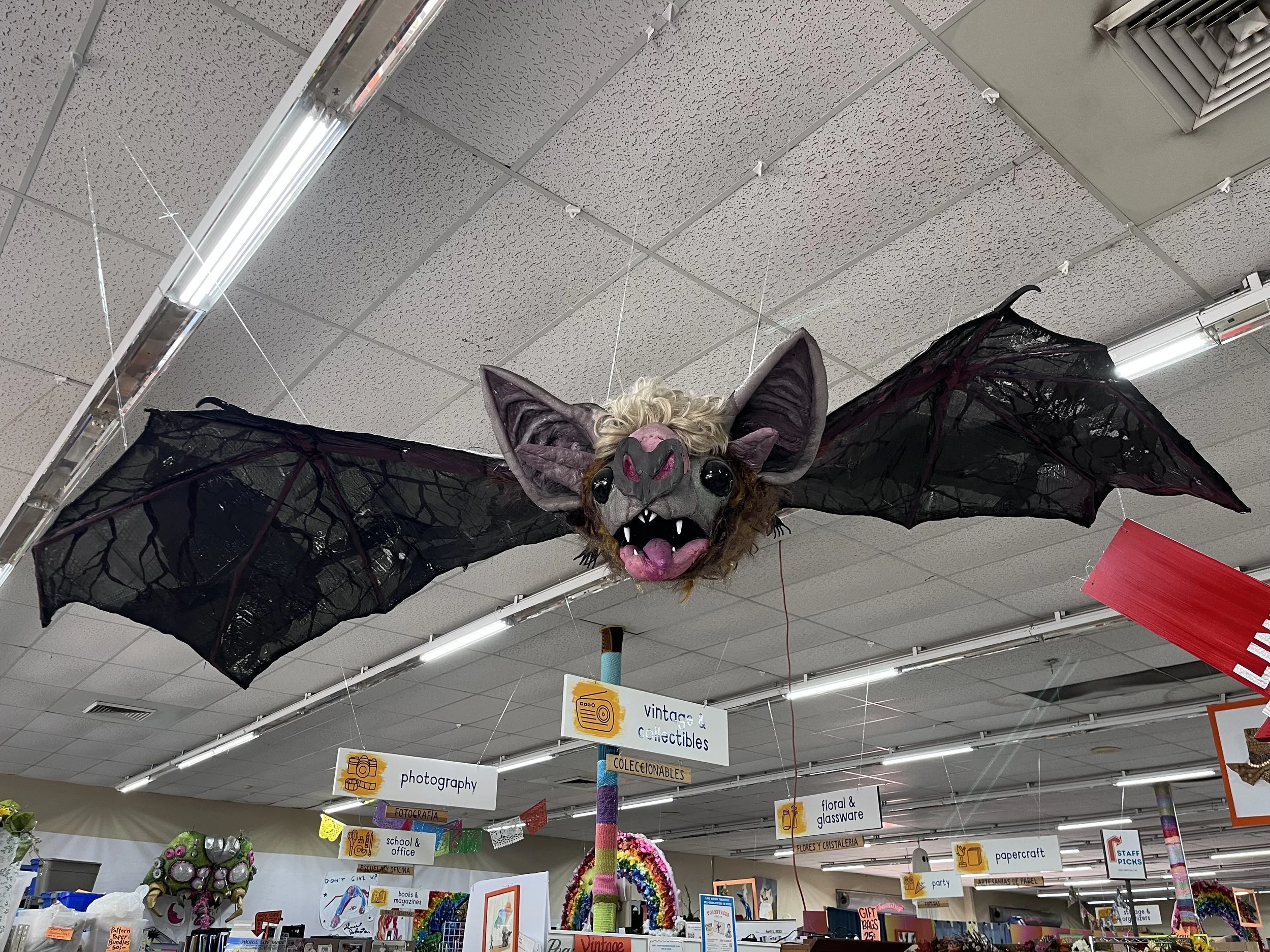 Ms. Batreuse (pronounced BAH-truce) is our informal mascot. You may recognize her as the giant bat hanging at the entrance to our creative reuse center.