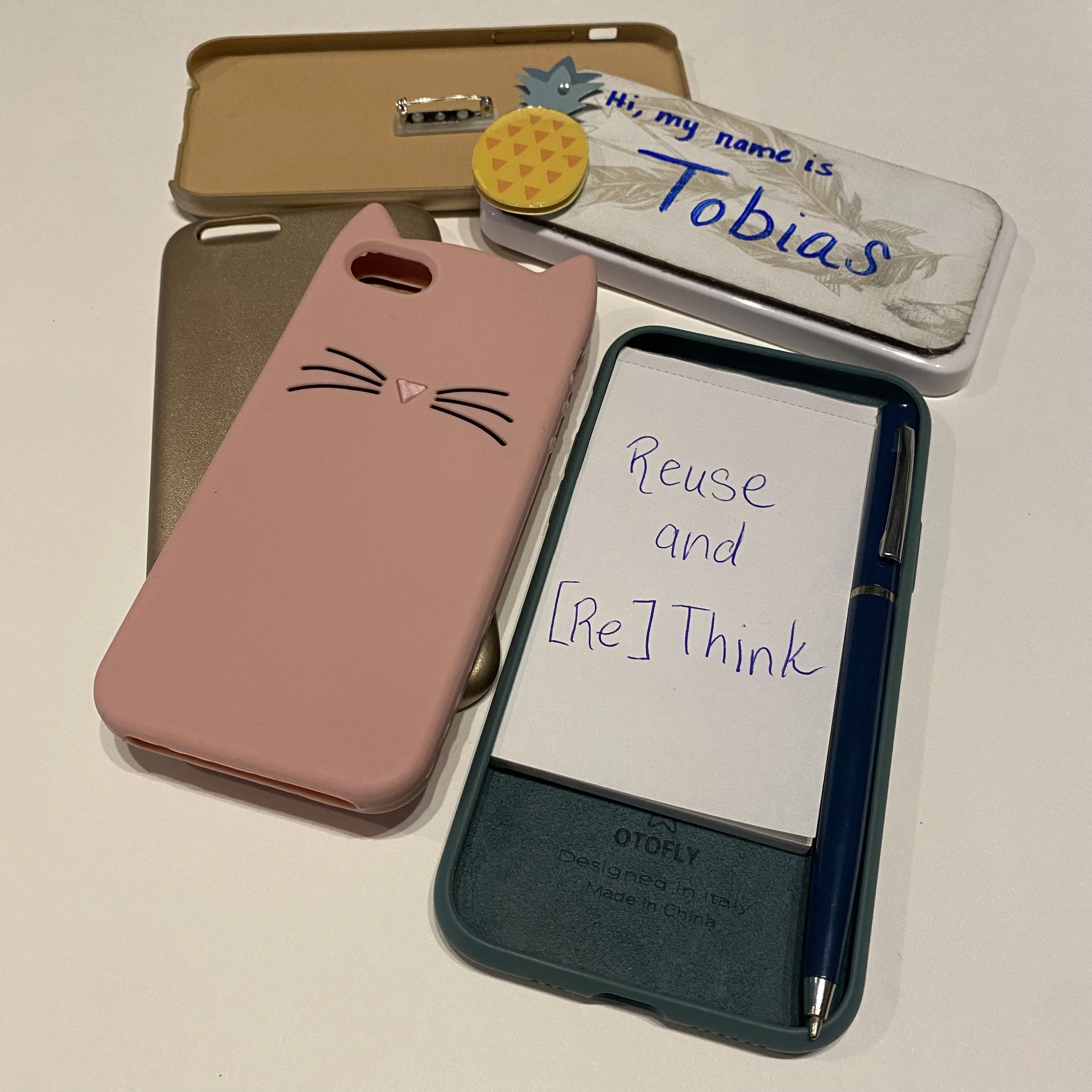 Our Reuse & [Re]Think item of the month is phone cases! These days, we all change our phones so quickly that our size-specific cases become obsolete! While we wish we could recycle them, the truth is that most municipal recycling programs can't properly process the mix of plastics and rubber compounds that they're made of. Instead of throwing your old case away, why not turn it into a nifty little notepad holder, a name tag, or a work of art like @calderful has done? The fur and nose are all from old cases!