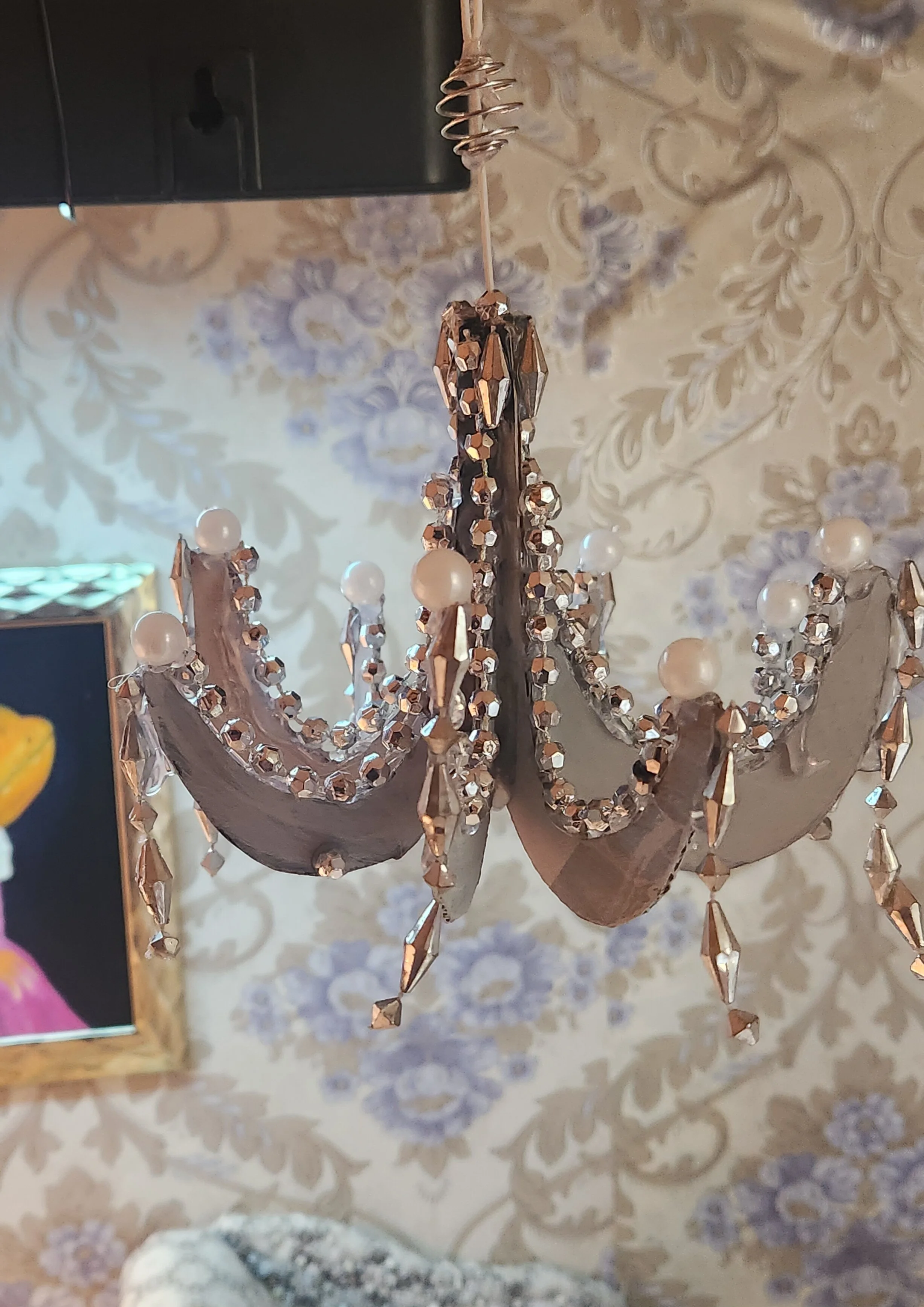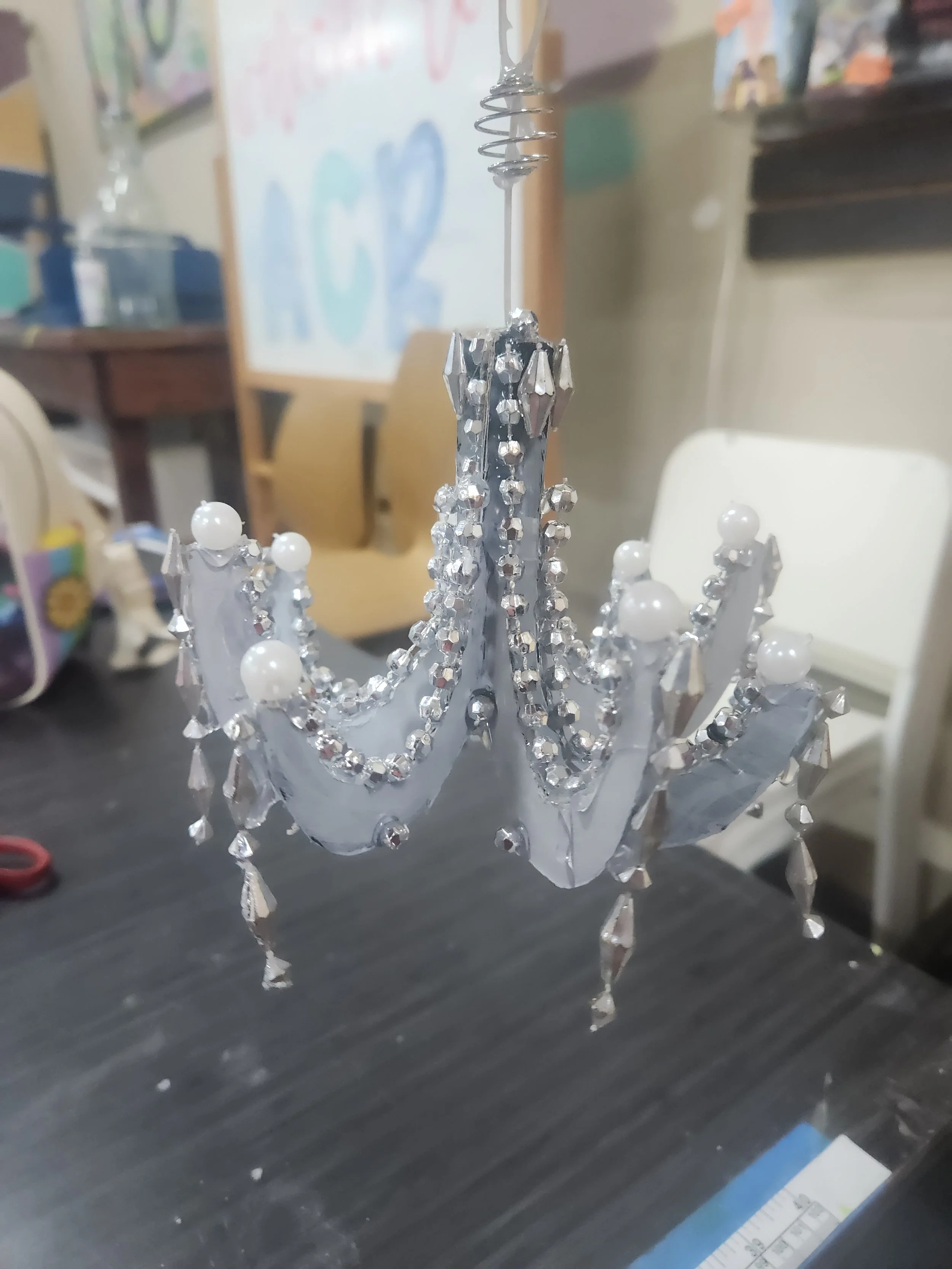 They started by creating a frame for the chandelier out of cardboard from a shoebox, then added strands of mardi gras bead necklaces. Our judges were incredibly jealous of the setup and wished it were human size so we could live in it!