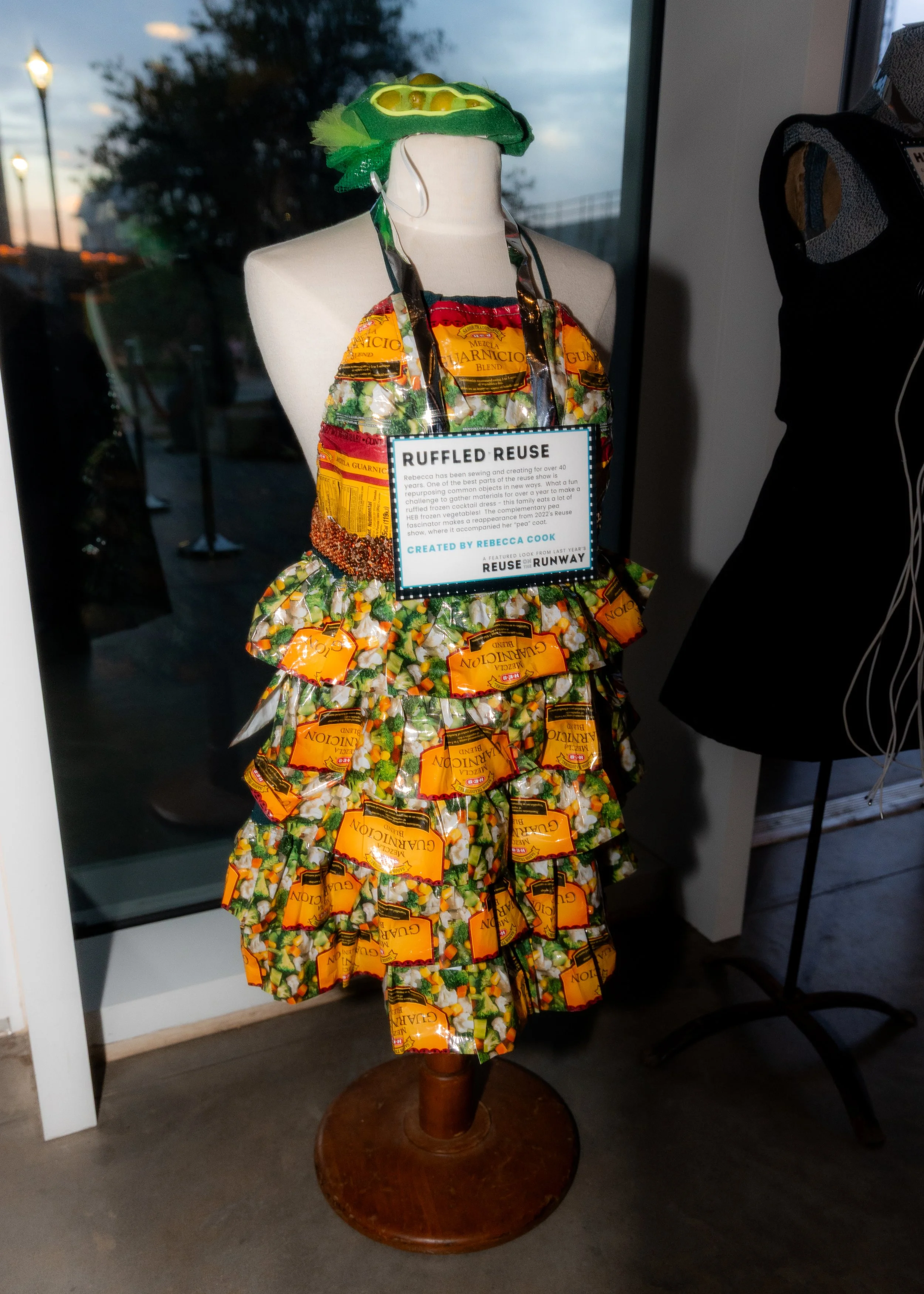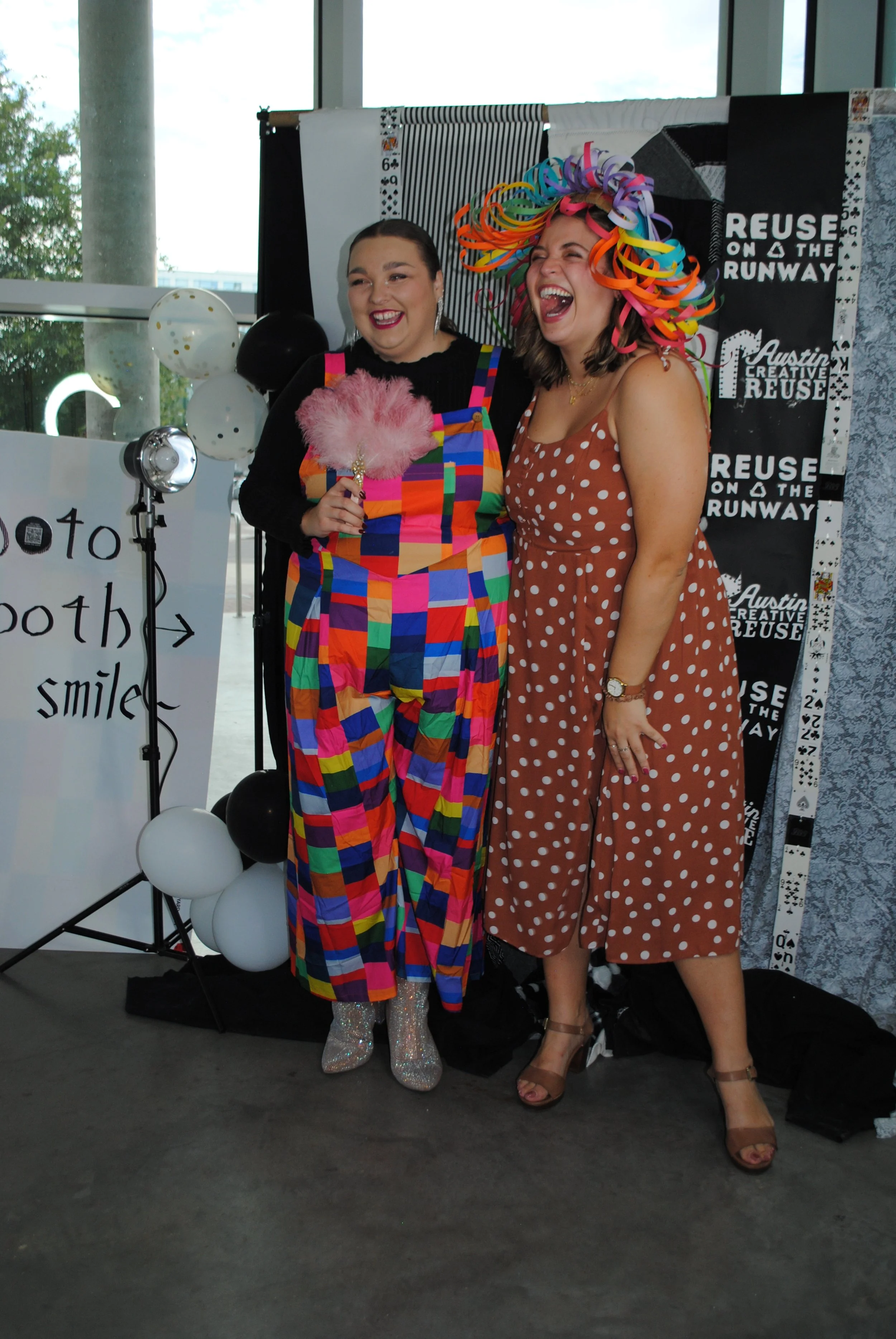 A huge THANK YOU to everyone who came out to support the 33 designers and artists who showcased 54 unique reuse pieces in our fourth annual fashion show, Reuse on the Runway, at Mueller’s Branch Park Pavilion on Saturday, September 20. Over 350 audience members took in the show, bid in the Silent Auction, enjoyed libations from local beverage makers and Mexican cuisine from the Pueblo Viejo food truck, played for prizes in the Cash to Treasure game, took funky photos in the photo booth, and got an in-depth view at some of the looks during Close Up on the Couture after the show.