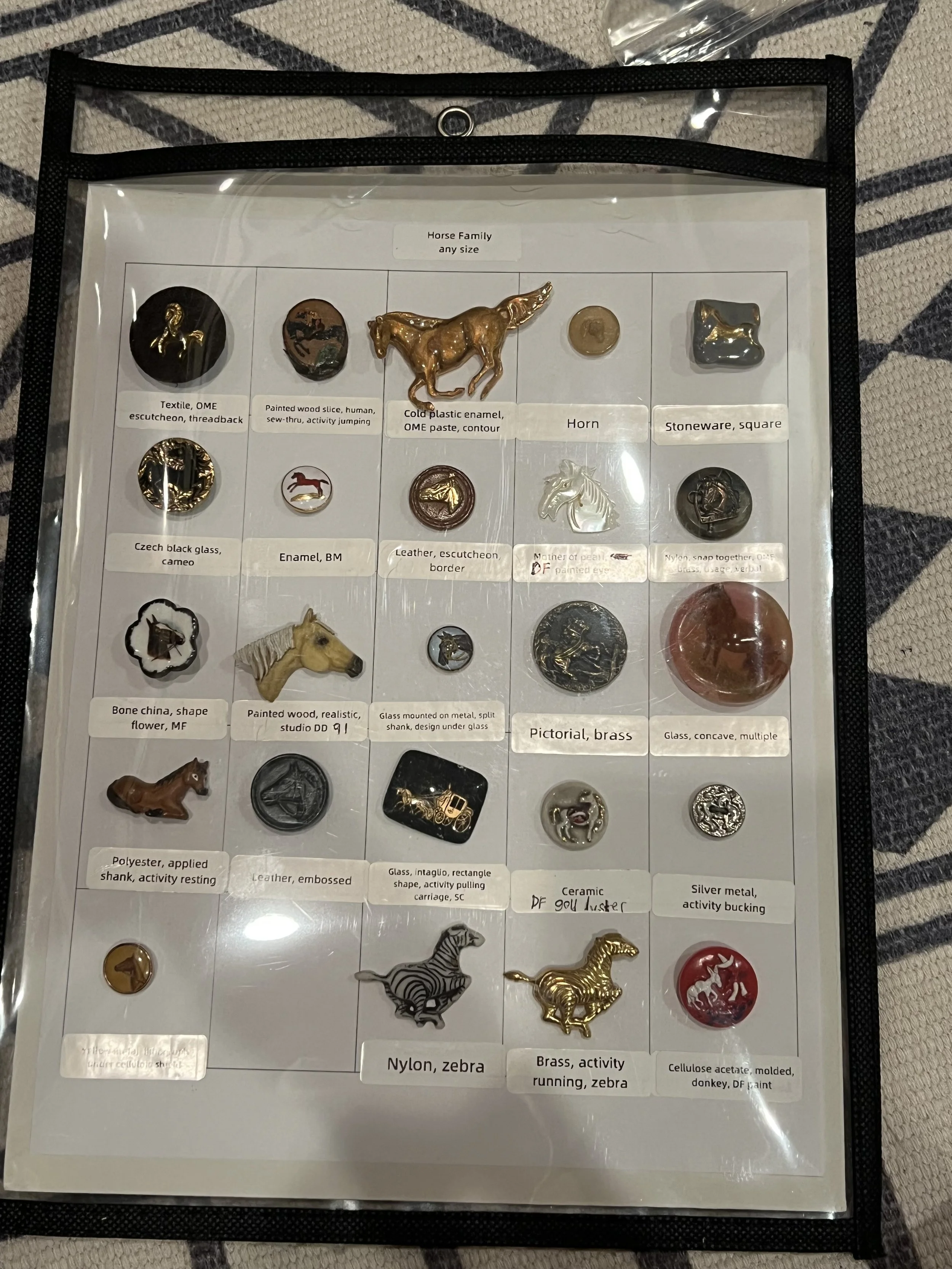 I also collect buttons. One thing I enjoy doing is mounting them on matte board and displaying them in picture frames. I also have put together entries for the Texas State Button Society spring show in April of 2026. The goal with the entries depends on the award category, but usually involves trying to find as many representations of the classification as possible. For example, for the horse award the goal is to find as many different materials as you can that have a horse as the subject. Other things also count as points and the whole thing is just a lot of fun!