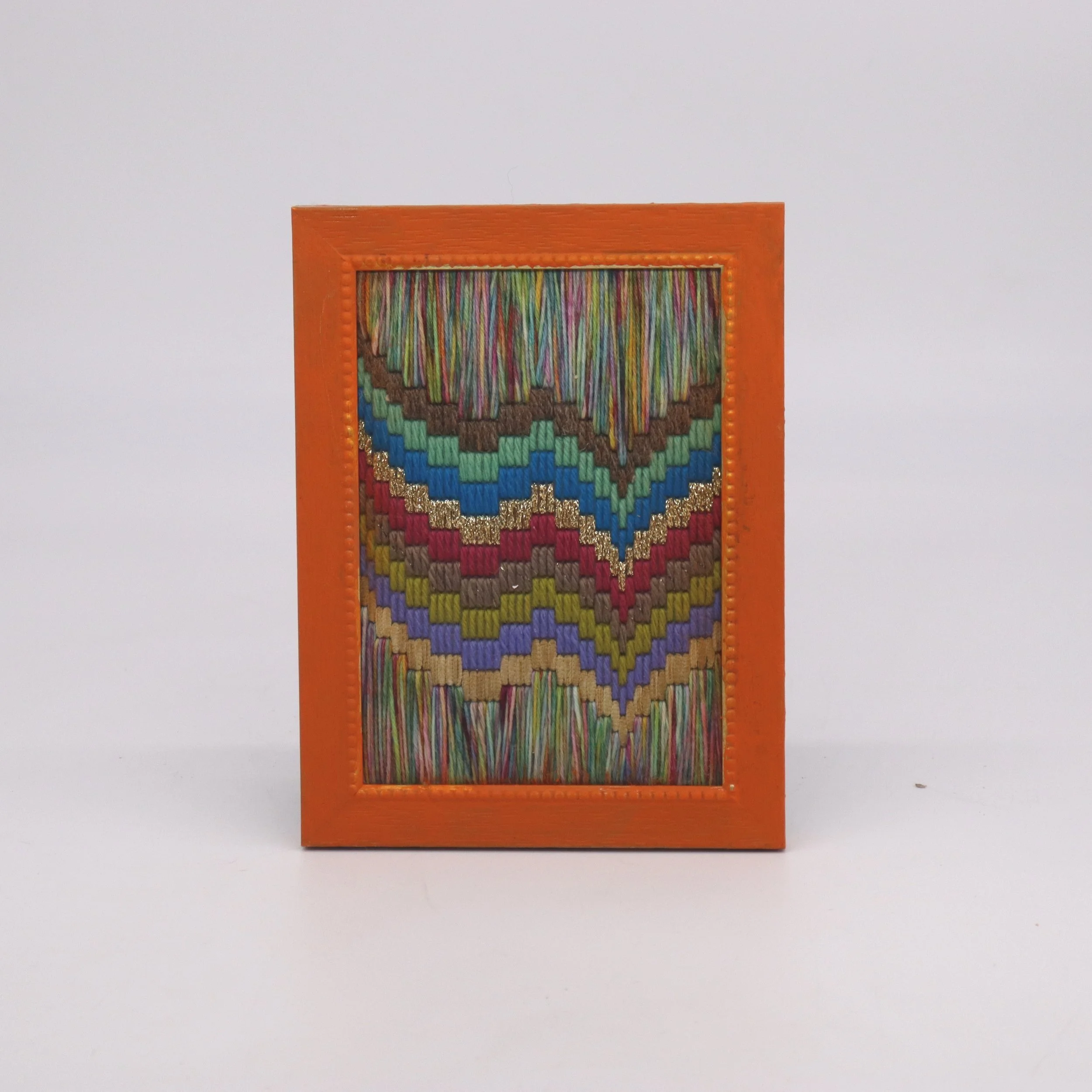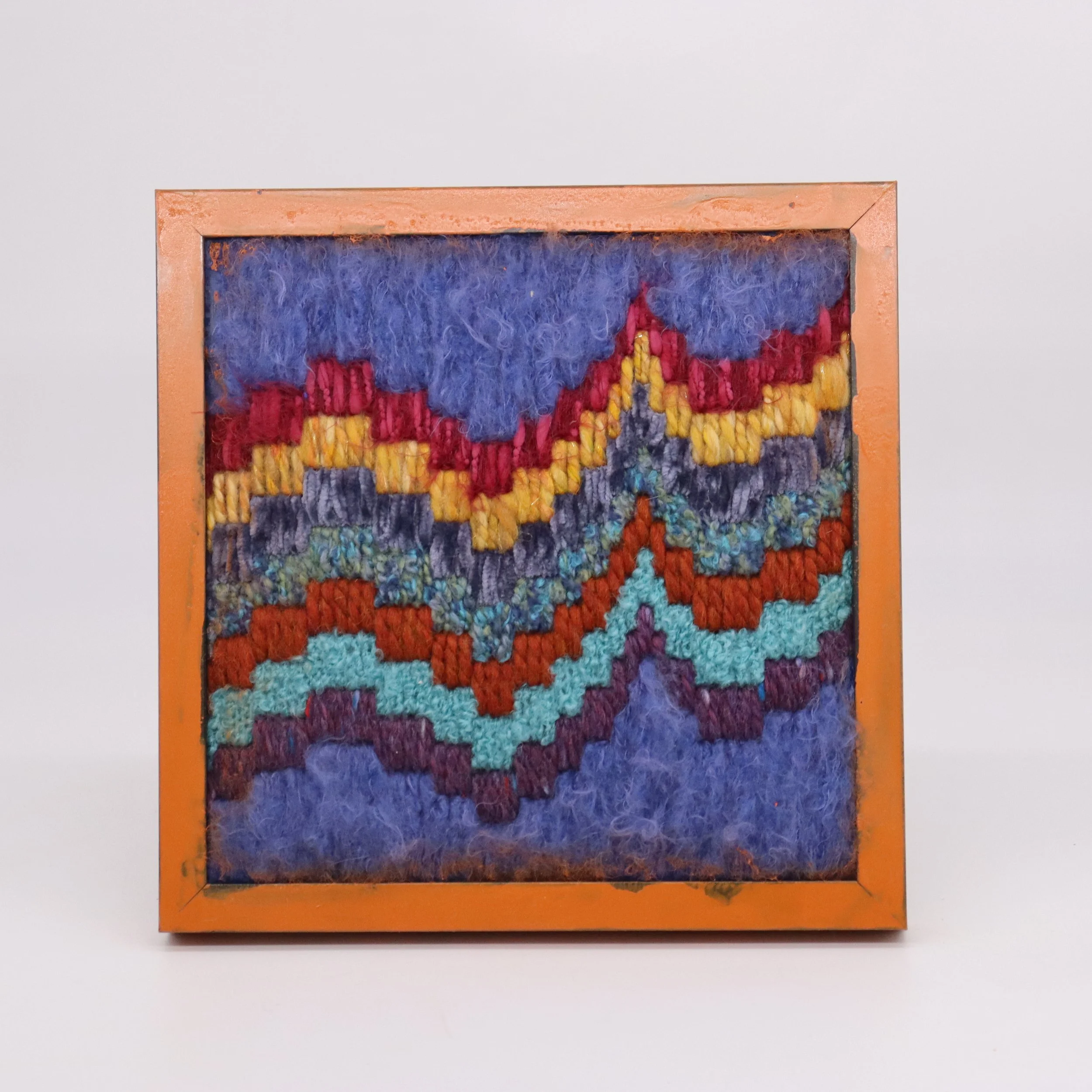 In 2020, I needed a new hobby and came across Bargello needlepoint. I was hooked right away! I began stitching for hours every day. I eventually quit using patterns (I now make it up as I go) and began to experiment with different fibers and types on canvas. I love using second hand materials because it provides a limit I can work inside of, and I am able to get more variety and find things I wouldn't normally choose myself. I also use secondhand and discarded photo frames for finishing, which saves me money and gives the art more personality. I really enjoy weaving on my rigid heddle loom and do other crafts here and there. I also love to hike and travel.