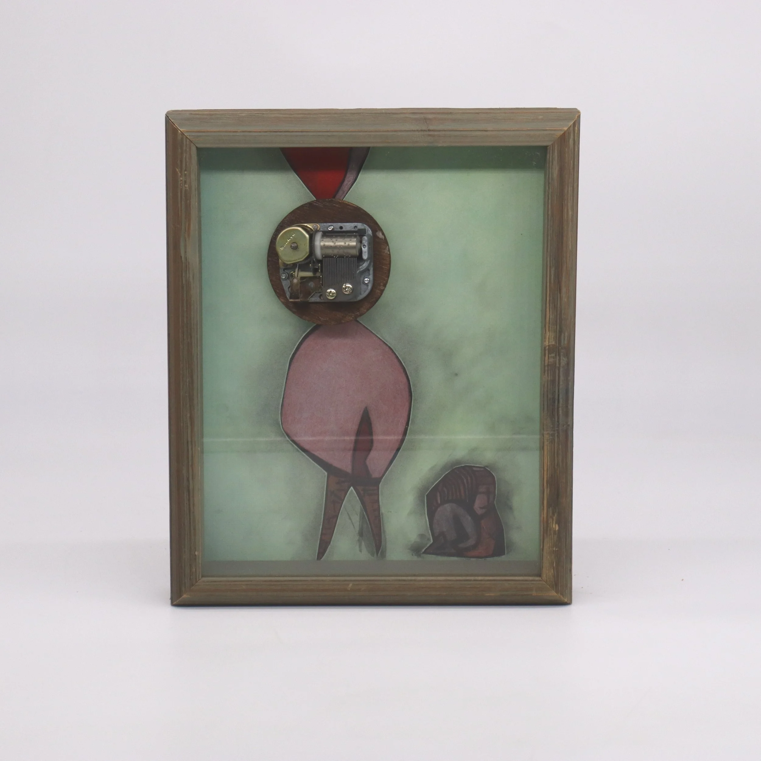 Materials Used: Vintage music box mechanism. Recycled card stock. Pastels. Colored pencils. Ink, Glue. Used frame.