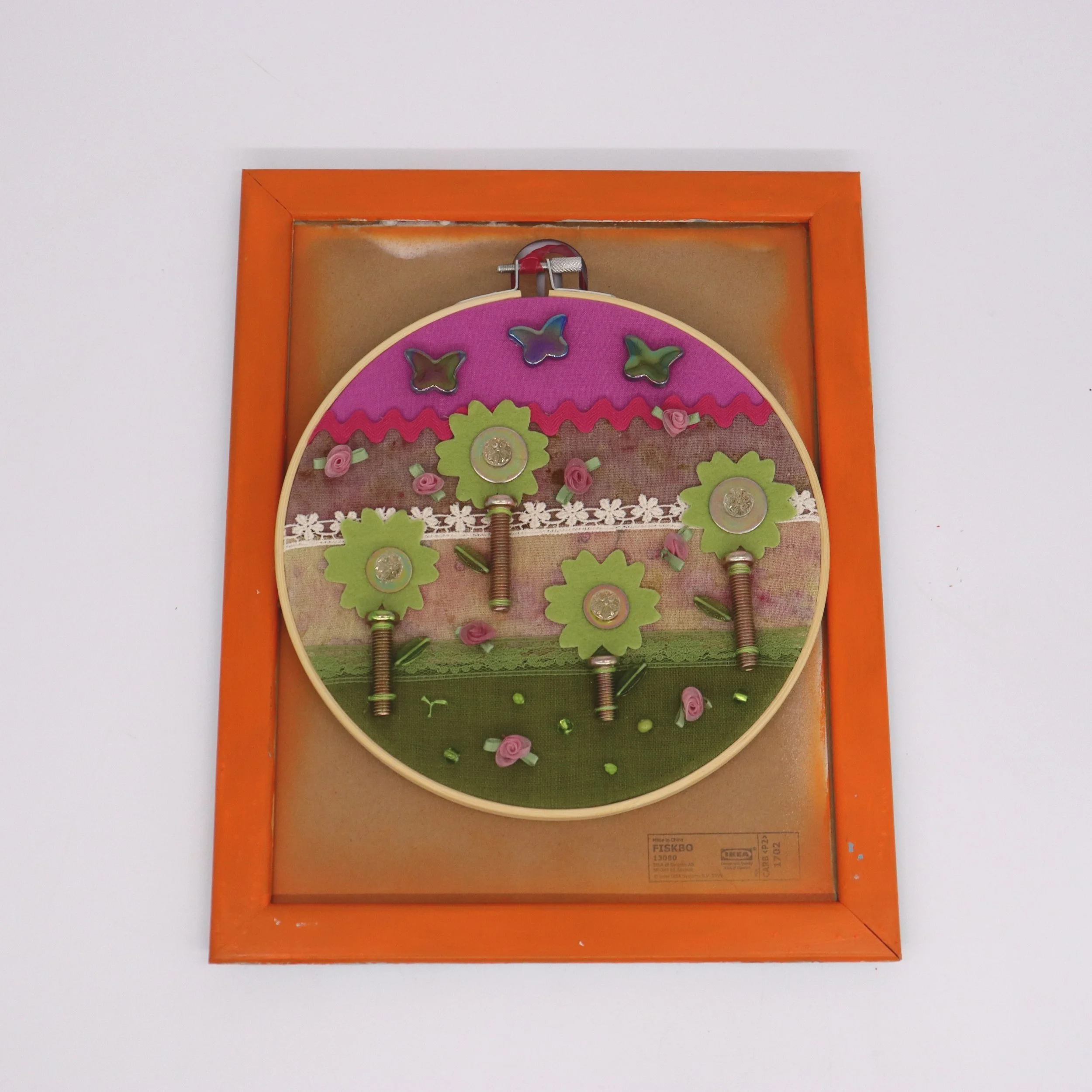 Materials Used: Cotton fabric, linen fabric, eco-dyed cotton ribbon, rick rack, lace trim, glass beads, buttons and butterflies, felt, metal washers and screws, ribbon flowers, embroidery thread, bamboo embroidery hoop.